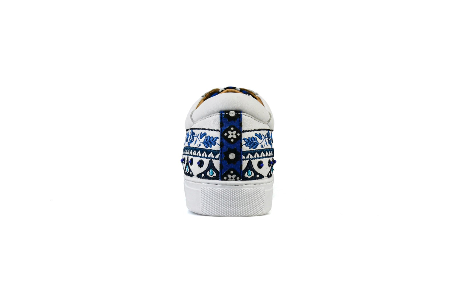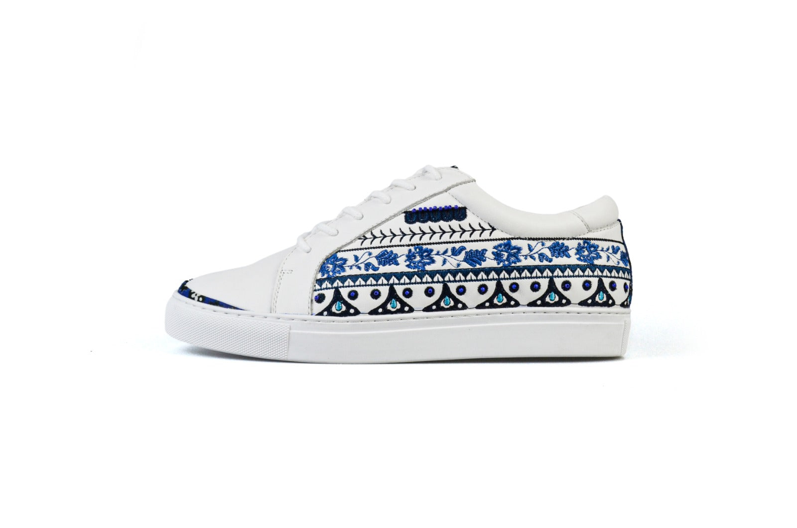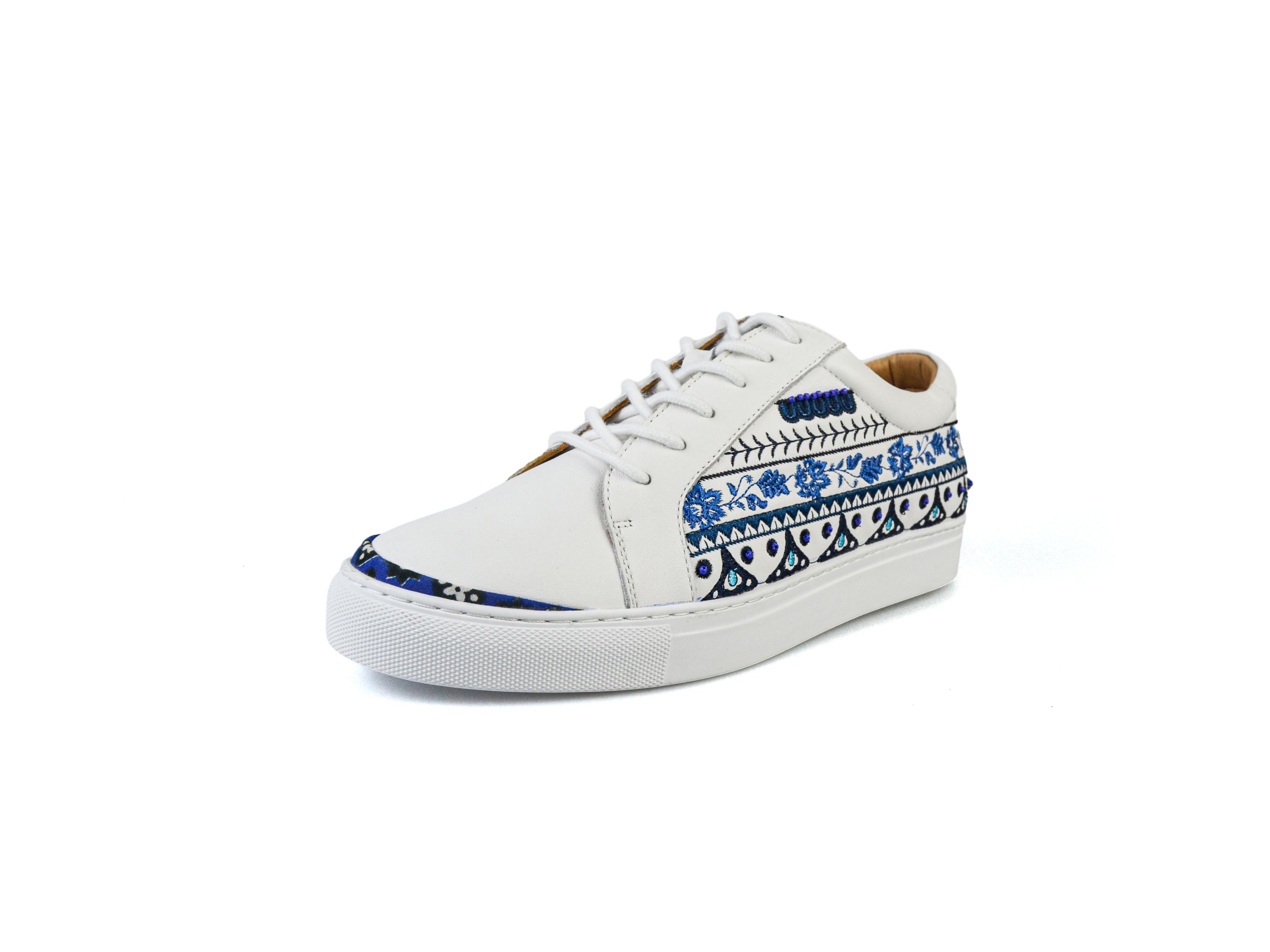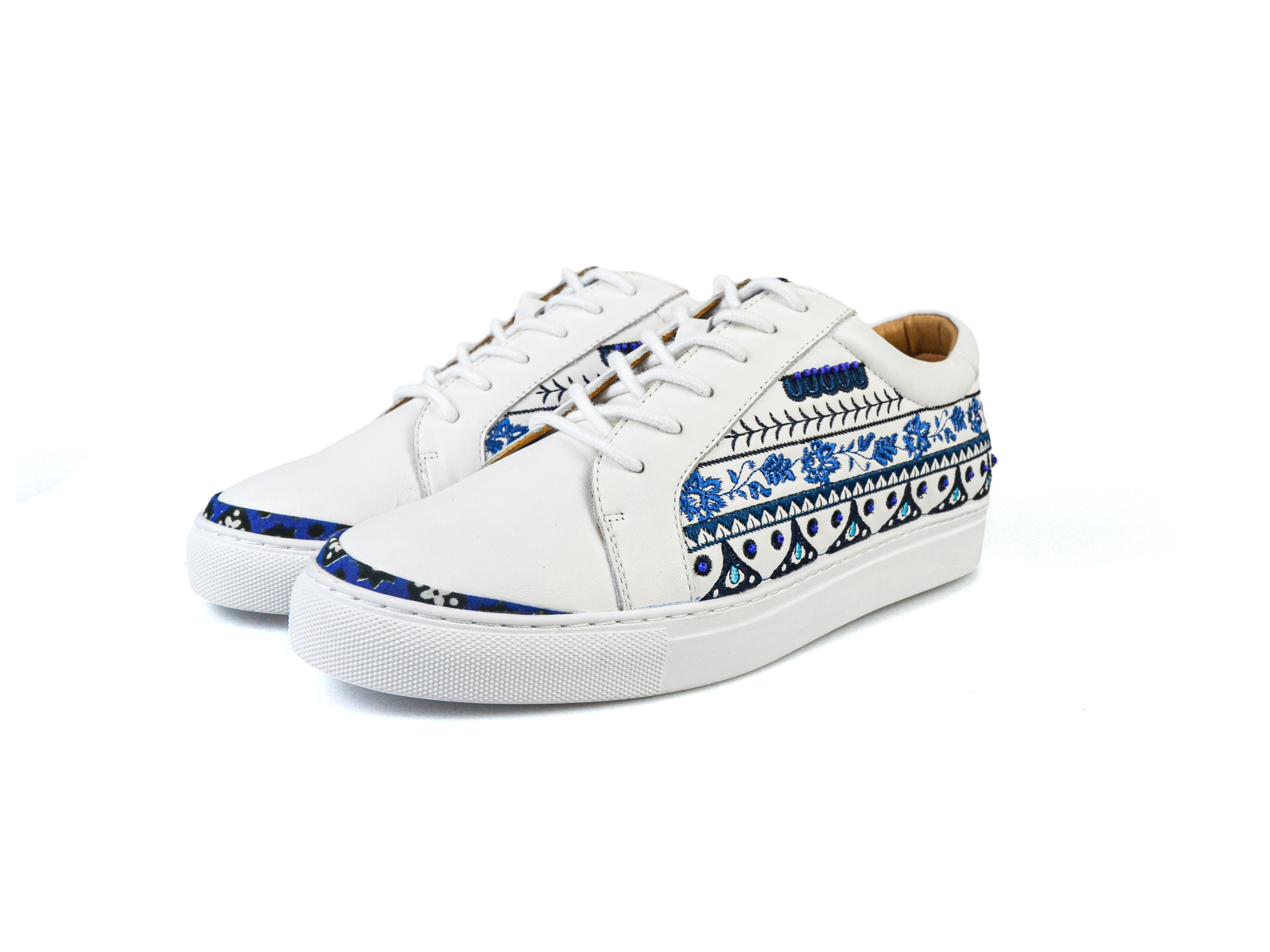 The pieces are embroidered and hand embellished. A shoe full of blue hues represents The blue represnets the water and sky, both symbols of peace and happiness for the Saraiki people. It is a constant remind of its simplicity which lies in complexities.
